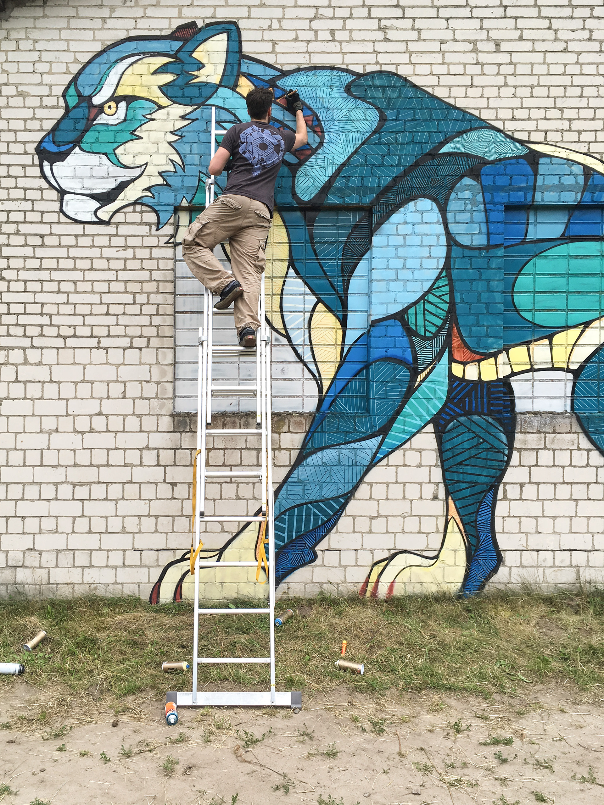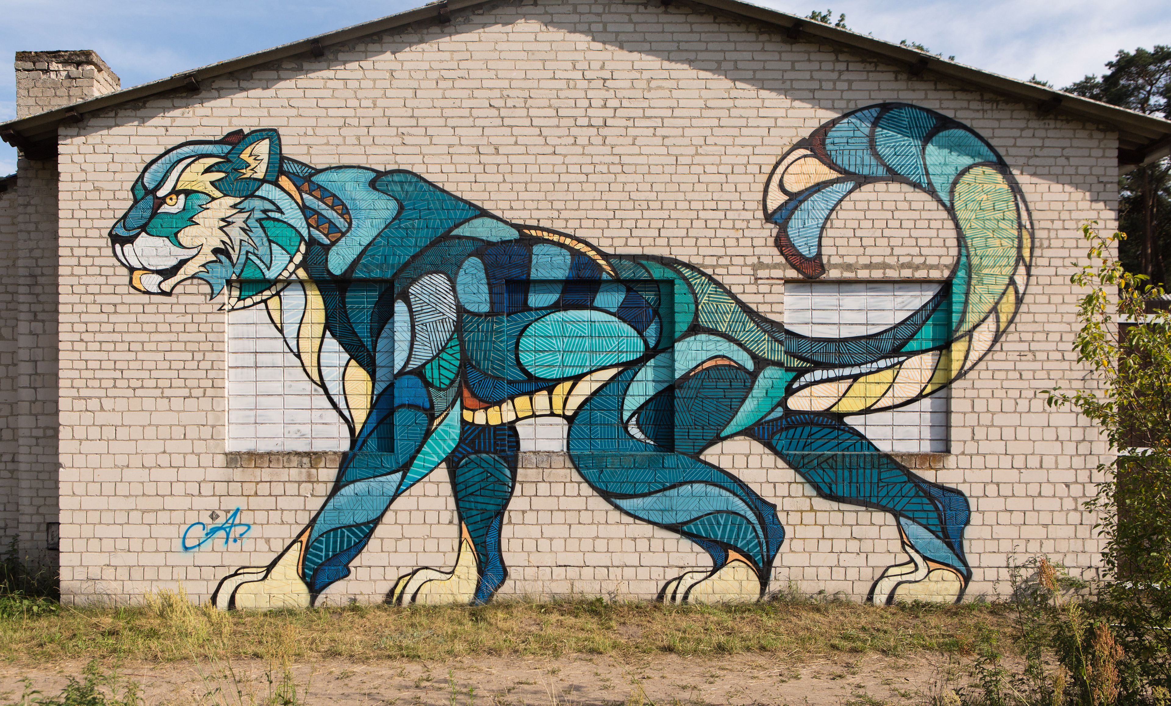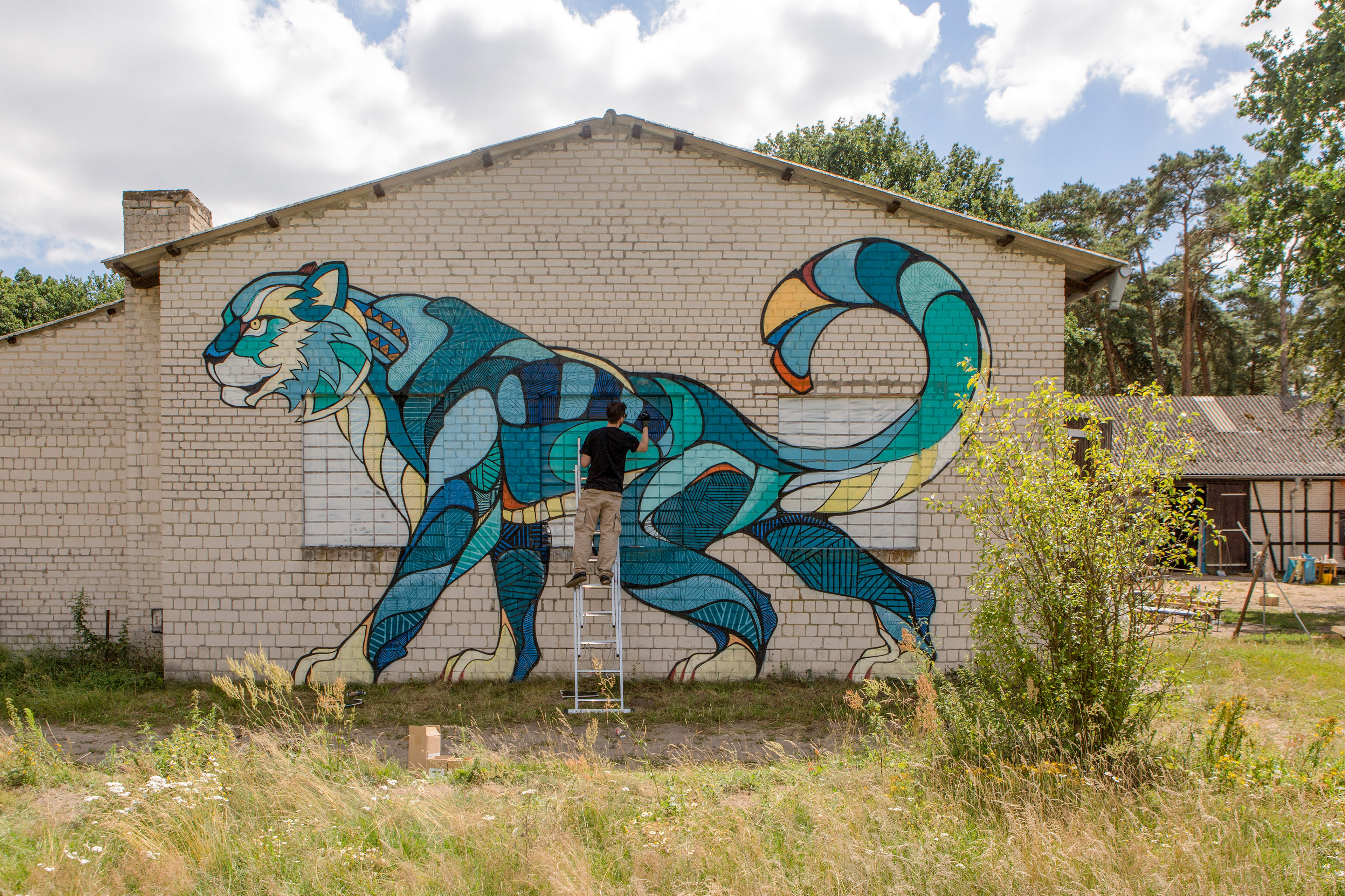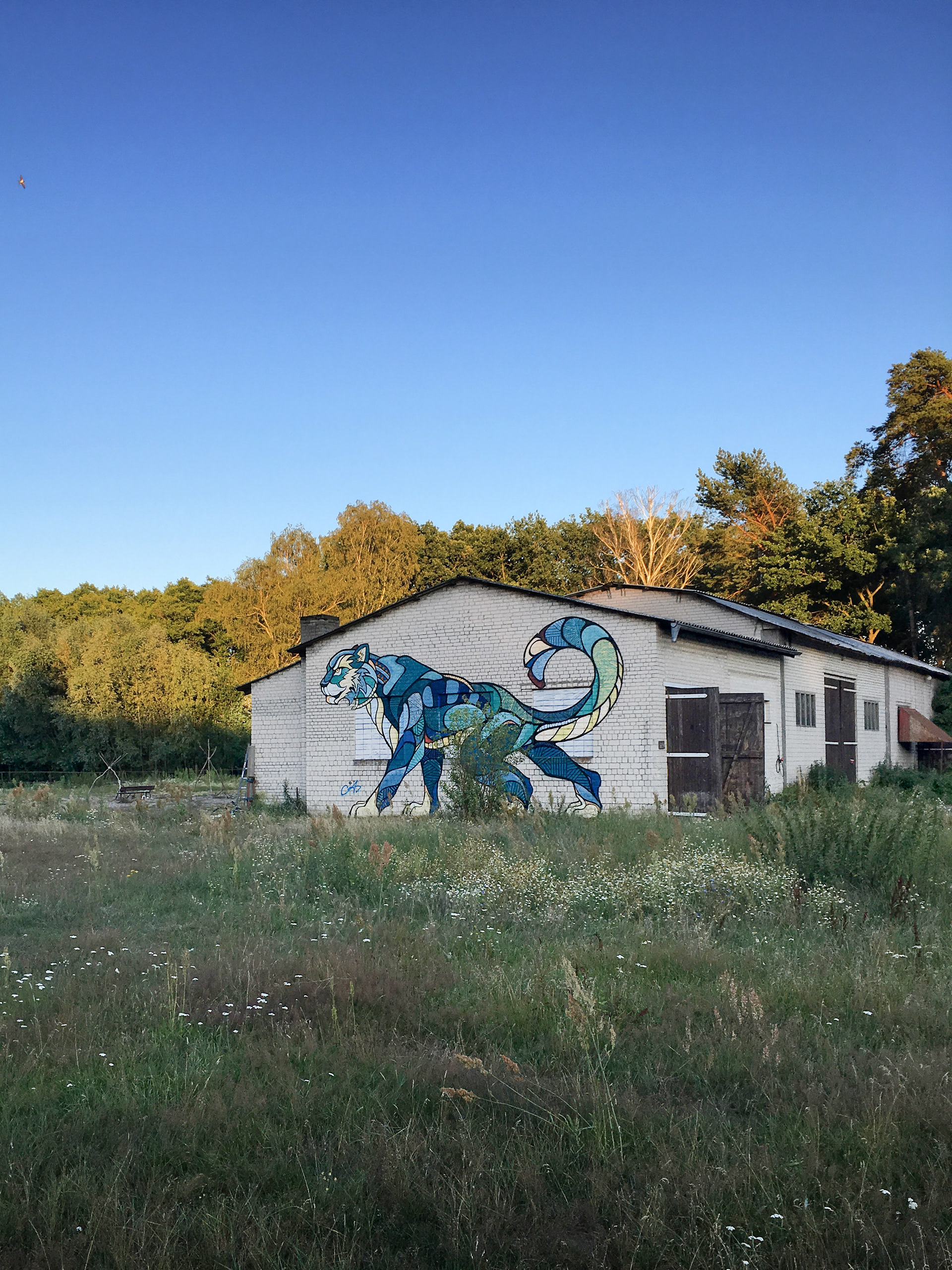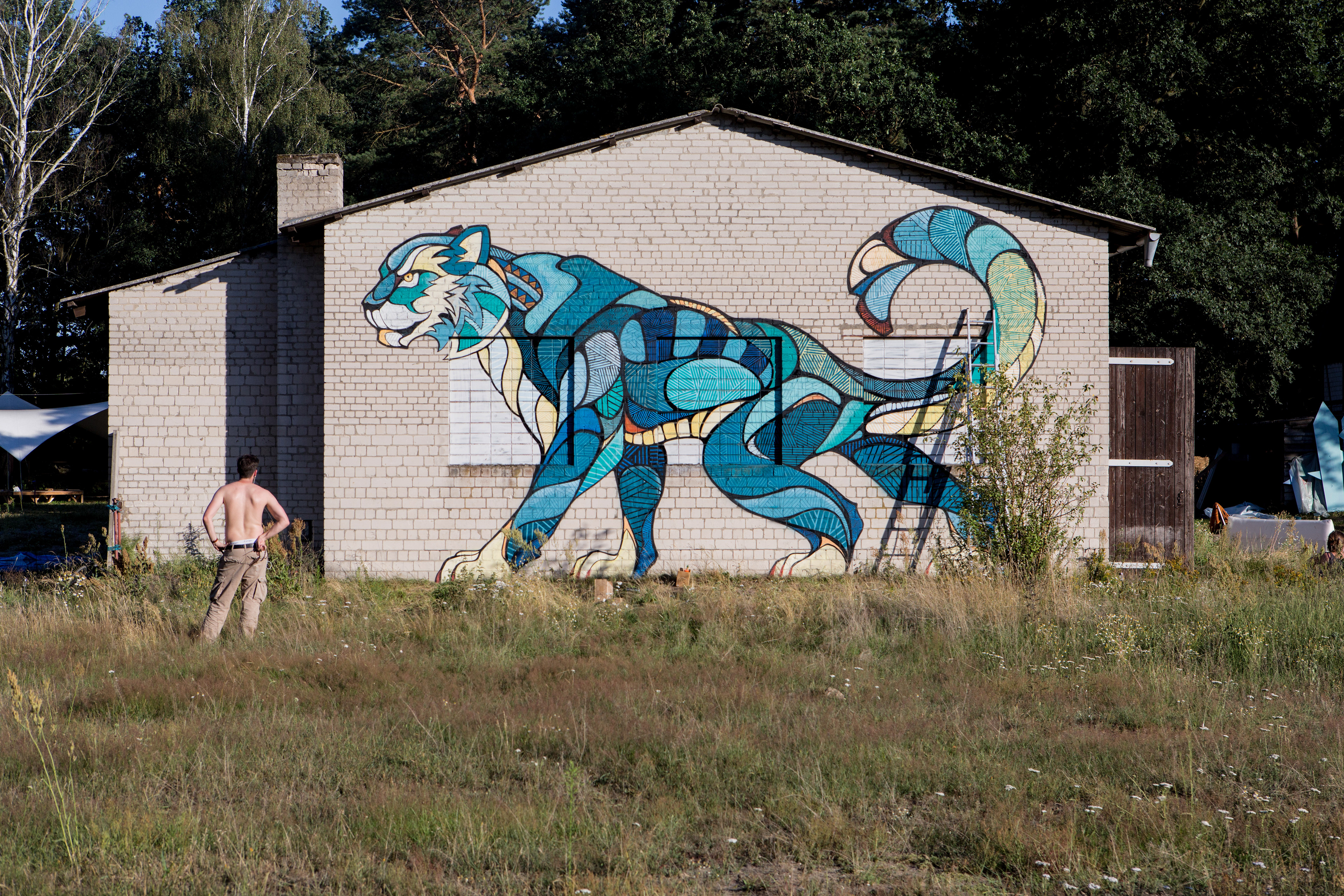Werkstatttraum Berlin e.V. organized a secret festival in in the countryside outside of Berlin. Since I was friends with those guys for some years, I was happy to create a mural for their event. This funky cat is about 8,5 to 4,5 meters. Thanks a lot to Alex Trattler, who made most of these photos.