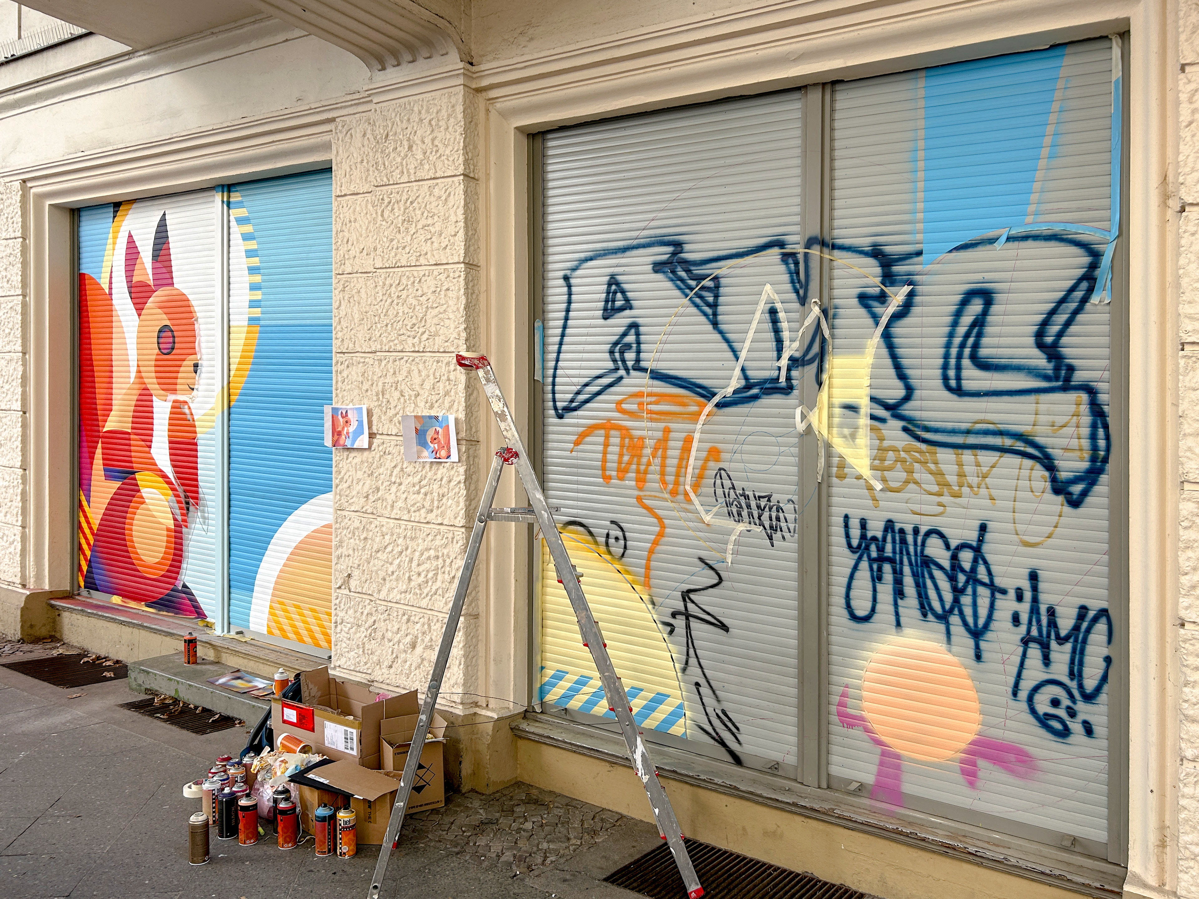 This was a special one: Two murals for the daycare of our kids. I already made their mascot quite a while ago and since they have so many squirrels playing in their garden and on their playground, it was a pretty easy choice. Had lots of fun painting right around the corner where we live in Berlin/Schöneberg and I am pretty sure our kids like it too!