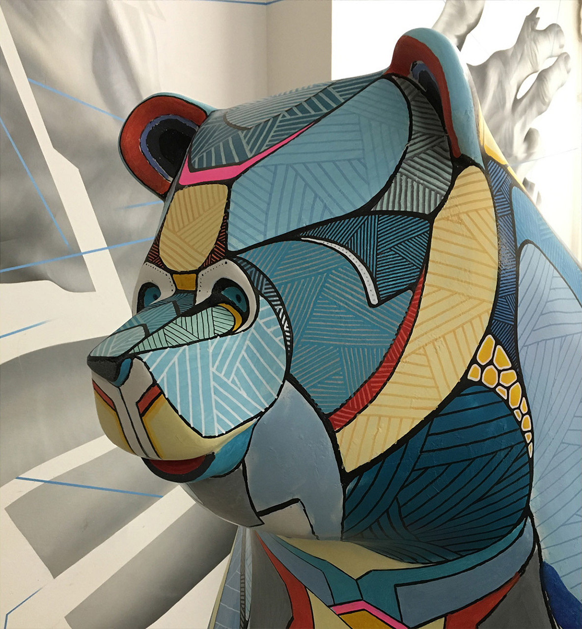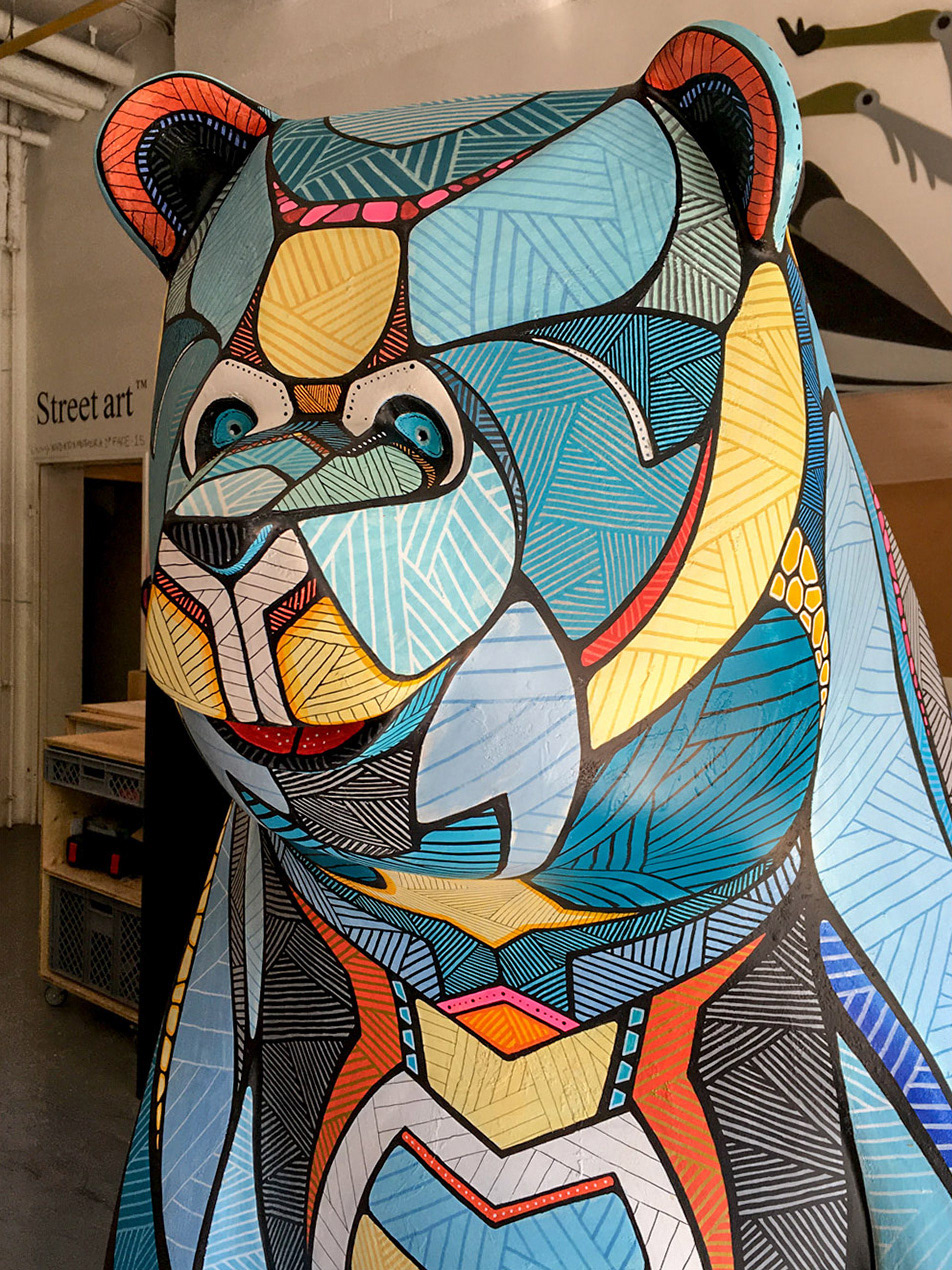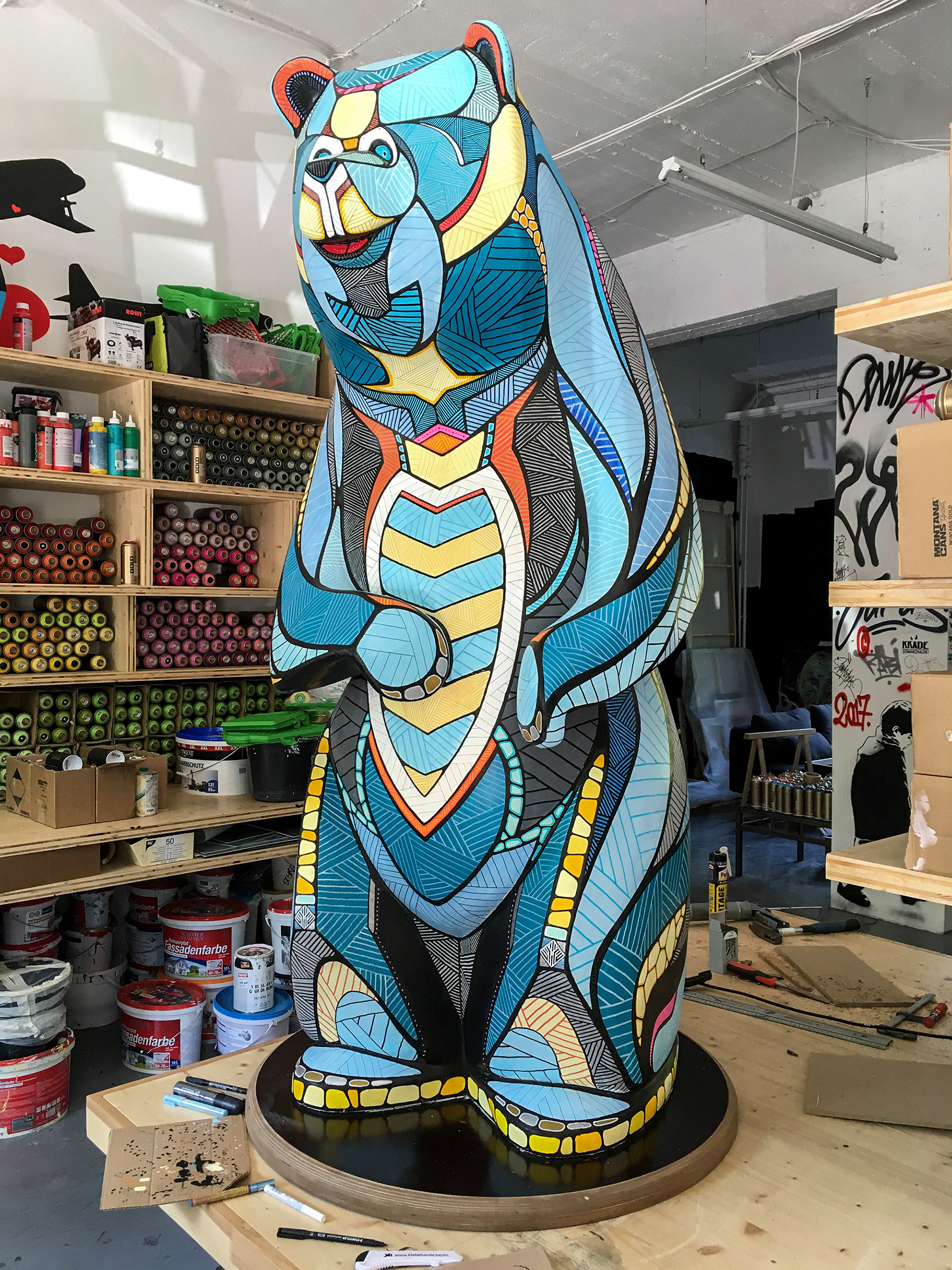 When URBAN NATION openend their Museum for Contemporary Art in Berlin I got invited to paint this original old Buddy Bear. They needed somebody to reimagine the typical Berlin Bear to become their mascot at the door. This kind of figurines are spread everywhere in Berlin, mostly painted in bright colors. I was lucky enough to get my hands on one of the old versions that you typically can't find anywhere anymore. They actually found it in the trash and saved it to let me bring it back to life! I was totally free to give it my personal style to let it stand out compared to all those other statues.