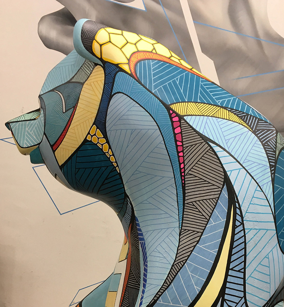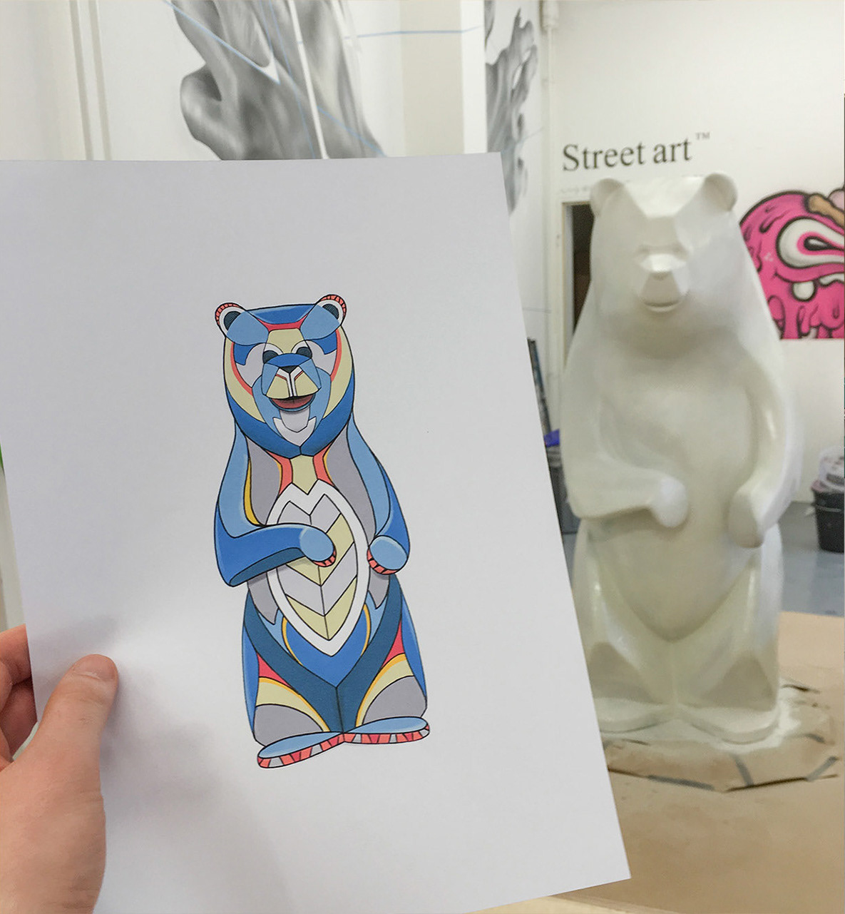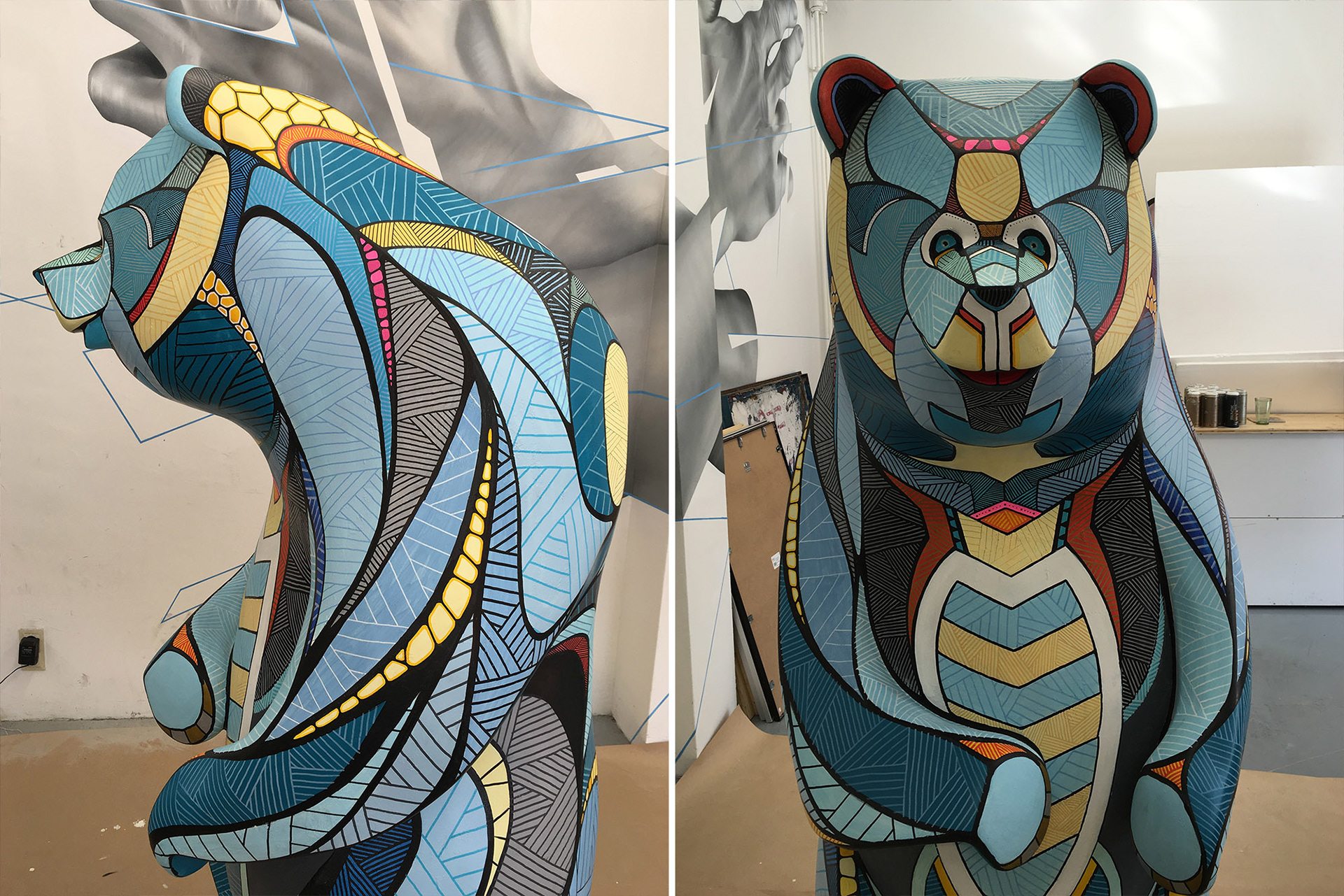 When URBAN NATION openend their Museum for Contemporary Art in Berlin I got invited to paint this original old Buddy Bear. They needed somebody to reimagine the typical Berlin Bear to become their mascot at the door. This kind of figurines are spread everywhere in Berlin, mostly painted in bright colors. I was lucky enough to get my hands on one of the old versions that you typically can't find anywhere anymore. They actually found it in the trash and saved it to let me bring it back to life! I was totally free to give it my personal style to let it stand out compared to all those other statues.